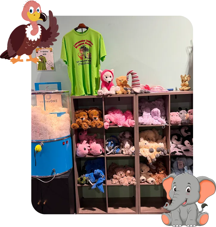 Take home a cuddly souvenir! Our Safari Pals Stuff 'n Fluff Factory offers a variety of adorable plush animals for children to select and take home as a memento of their bounce house adventure. This popular station features cute safari-themed stuffed toys that make perfect keepsakes or gifts. A fun addition to any visit or birthday celebration that gives kids something special to remember their day of fun!