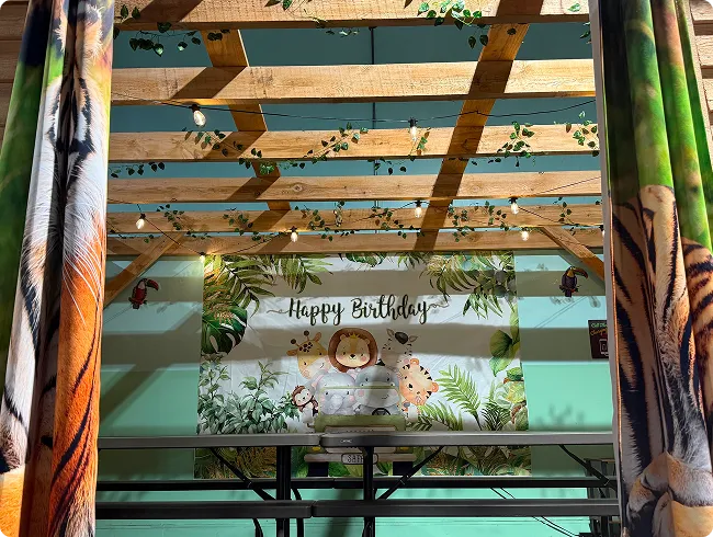 From jungle-themed birthday huts to tropical snack shacks and cozy corners for little explorers, every part of our bounce house is designed to delight. Take a look inside and discover the playful spaces, vibrant zones, and safari surprises that make every visit unforgettable. Whether you're planning a party or just popping in for a wild day of fun, this is your sneak peek into the adventure that awaits!